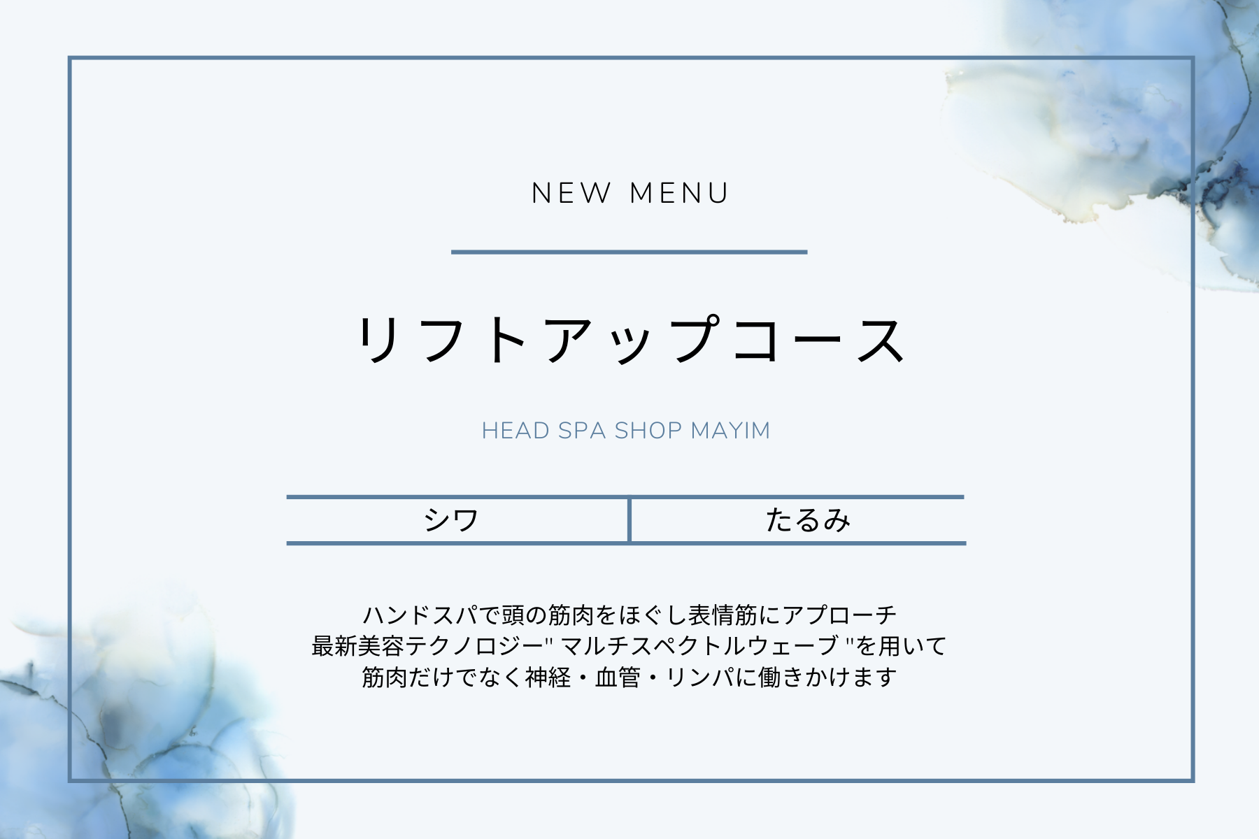 頭皮診断→ドライ(頭頂・側頭・後頭部・目・耳・首肩)→デコルテ・背面・首肩オイルリンパ→マッサージSP→頭浸浴→プレミアムクリームバス→ 骨格強化ヘアトリートメント→首肩→ヒト幹細胞培養ローション→ メディスパ→セルフブロー→アイロン仕上げ