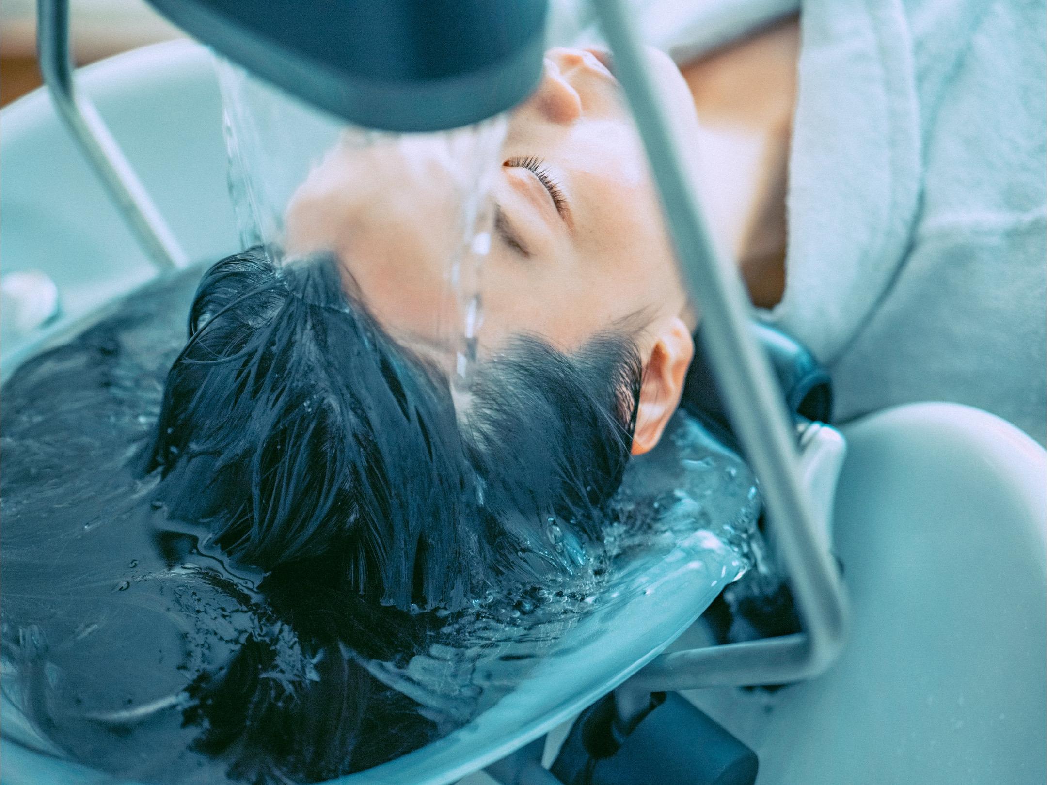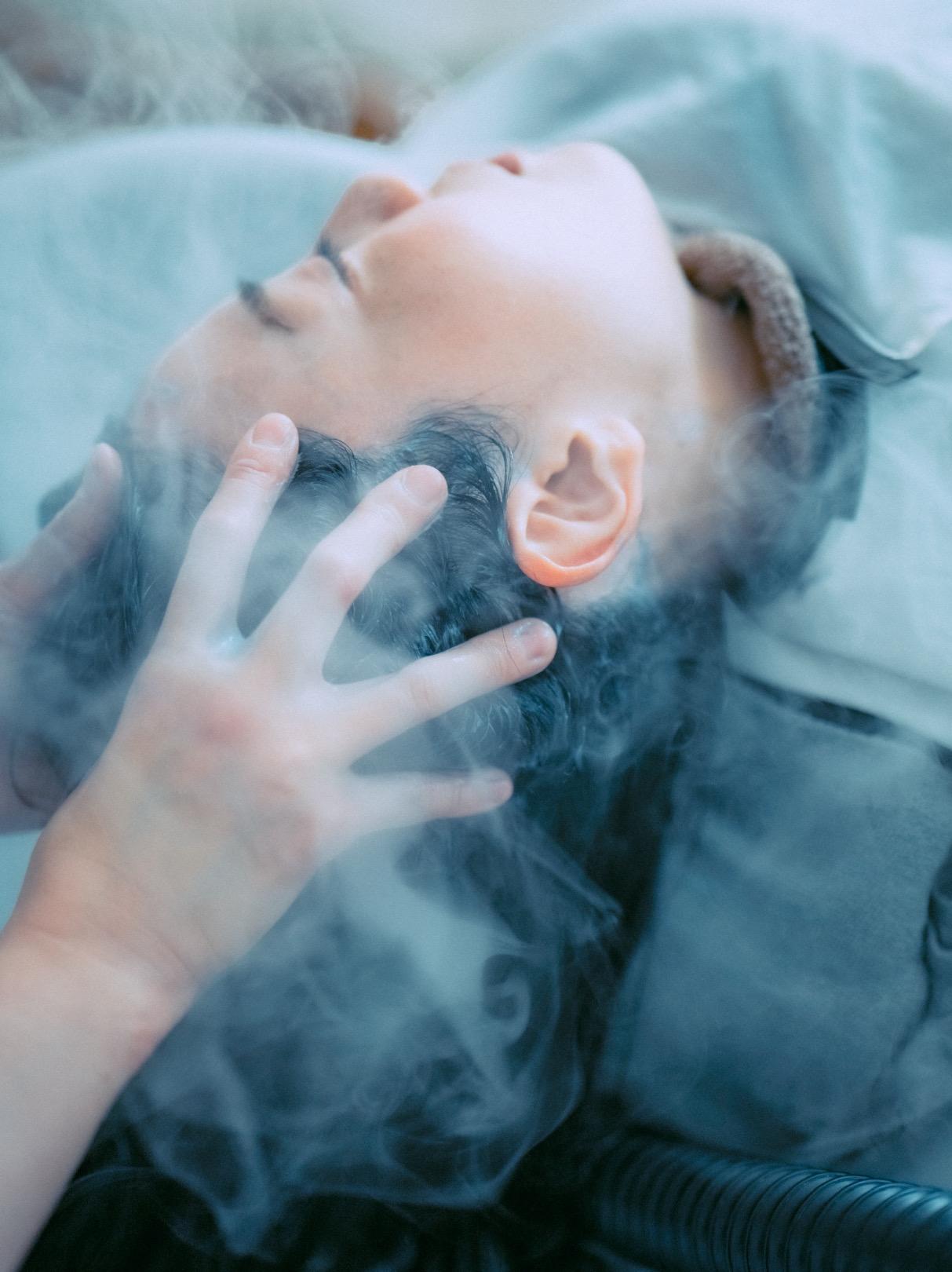 頭皮状態に合わせたプロダクツを選定。ウルトラファインバブル炭酸泉を掛け流す頭浸浴で血行促進をしながら、頭皮の毛穴詰まりや皮脂汚れなども除去し、髪の残留物までクレンジング。最後は丁寧に保湿し肌のターンオーバーを正常化、健康的な頭皮に導きます。